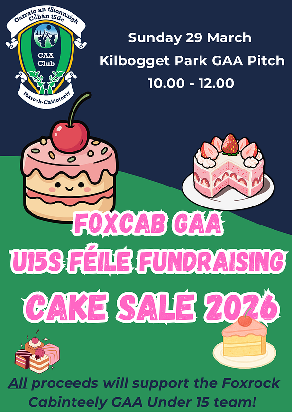 As part of their efforts to fund their gear and equipment for the tournament, the squad are holding a Cake Sale at the Senior Pitch in Kilbogget Park on Sunday 29 March.